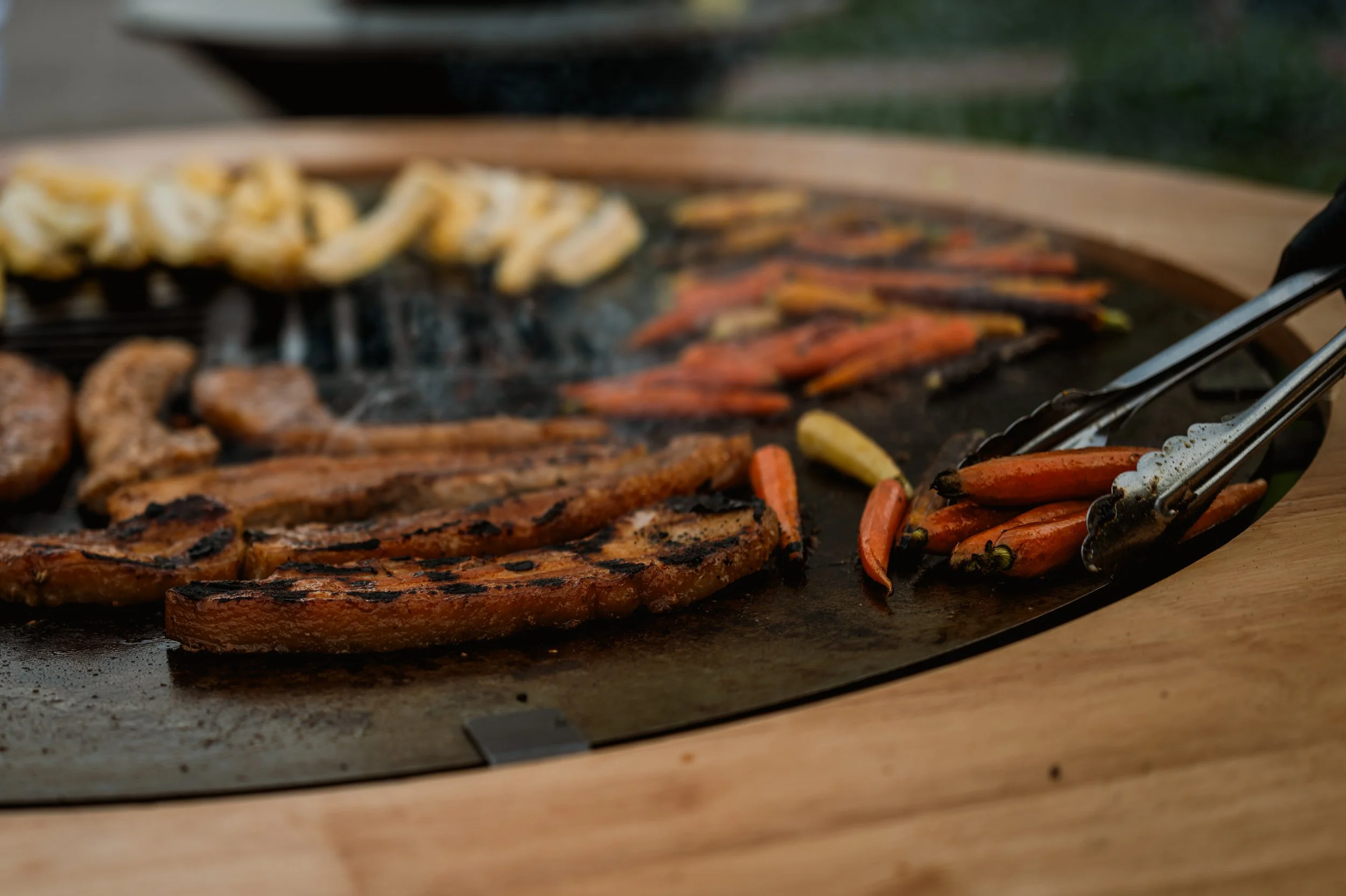 Sudfire's flat cooking surface creates natural heat zones: searing heat at the center, medium heat in the middle, and a cooler edge for resting. Cook steaks, vegetables, and sides together—no juggling burners, no flare-ups. Everything on one surface. Perfect timing, every time.